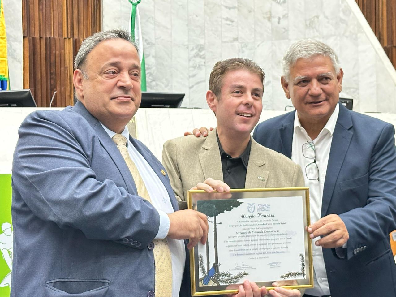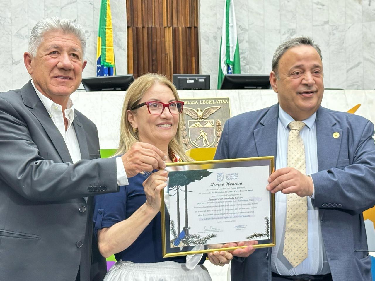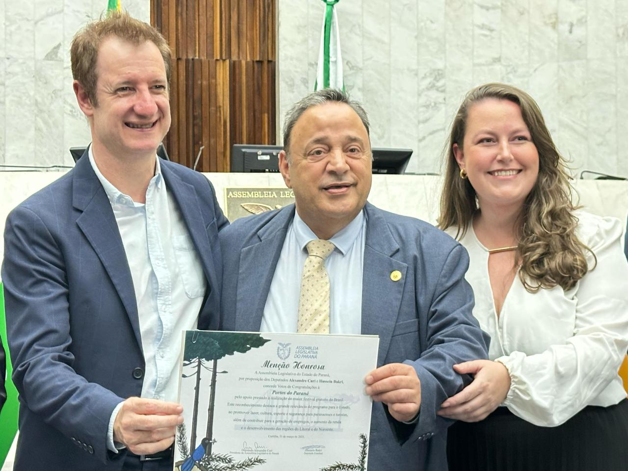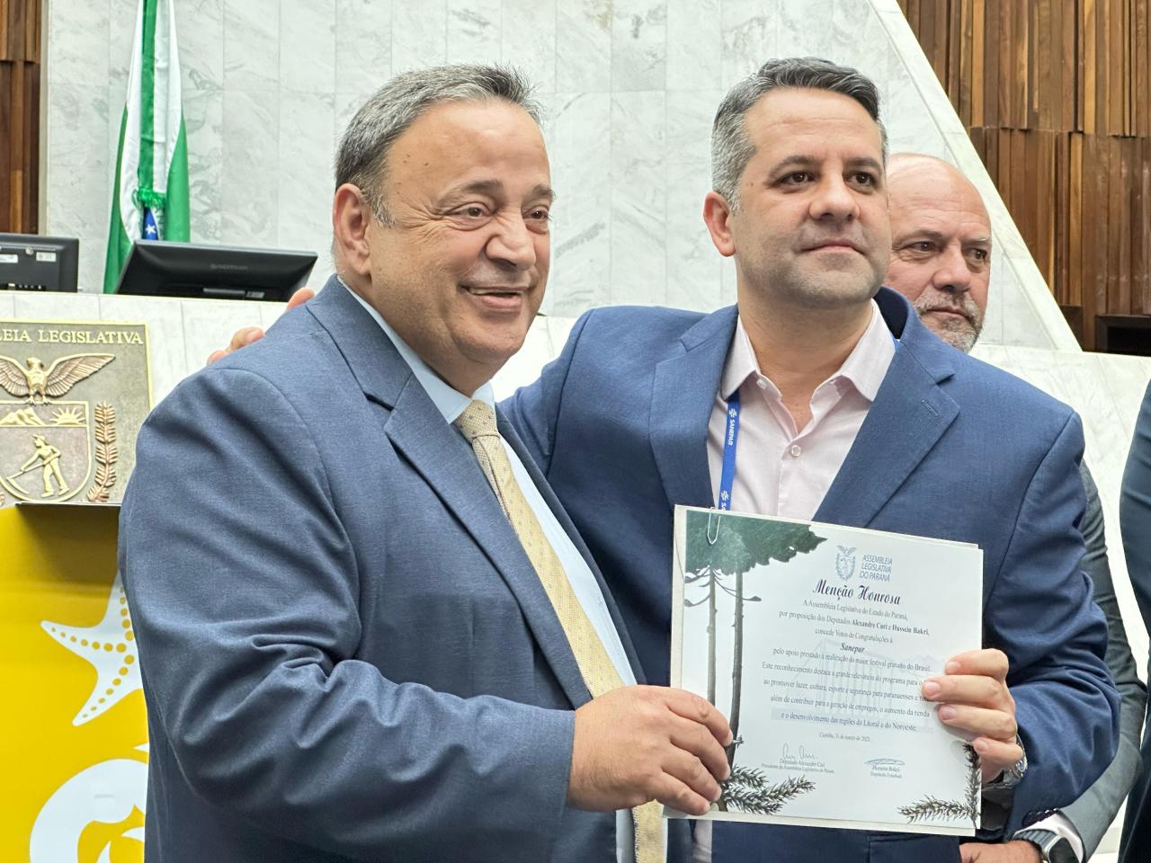 “Estamos prestando nossas homenagens a todos por terem realizado e colaborado com o maior verão da história do Paraná e o maior festival gratuito do Brasil. Quase 2 milhões de pessoas lá estiveram assistindo aos shows. Agradeço a todos vocês por terem contribuído para que o comércio estivesse satisfeito e para que os hotéis estivessem lotados”, comemorou o Presidente da Casa, deputado Alexandre Curi (PSD).
